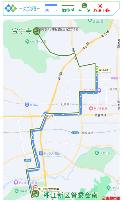 二、322路:宝宁寺至湘江新区管委会南(原观沙小区开往湘江新区管委会南)