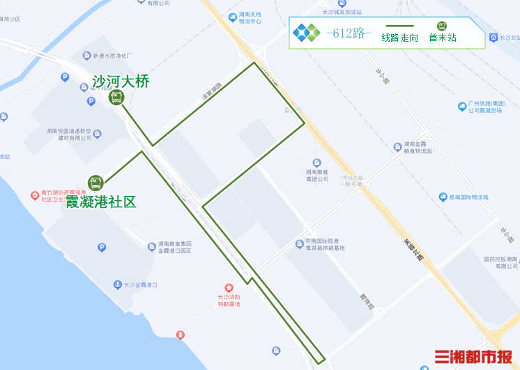 从霞凝港社区发车,经汤家湖路、湘江北路、开顺路、霞凝路、兴旺路、芙蓉北路、汤家湖路、湘江北路至沙河大桥,往返运行。