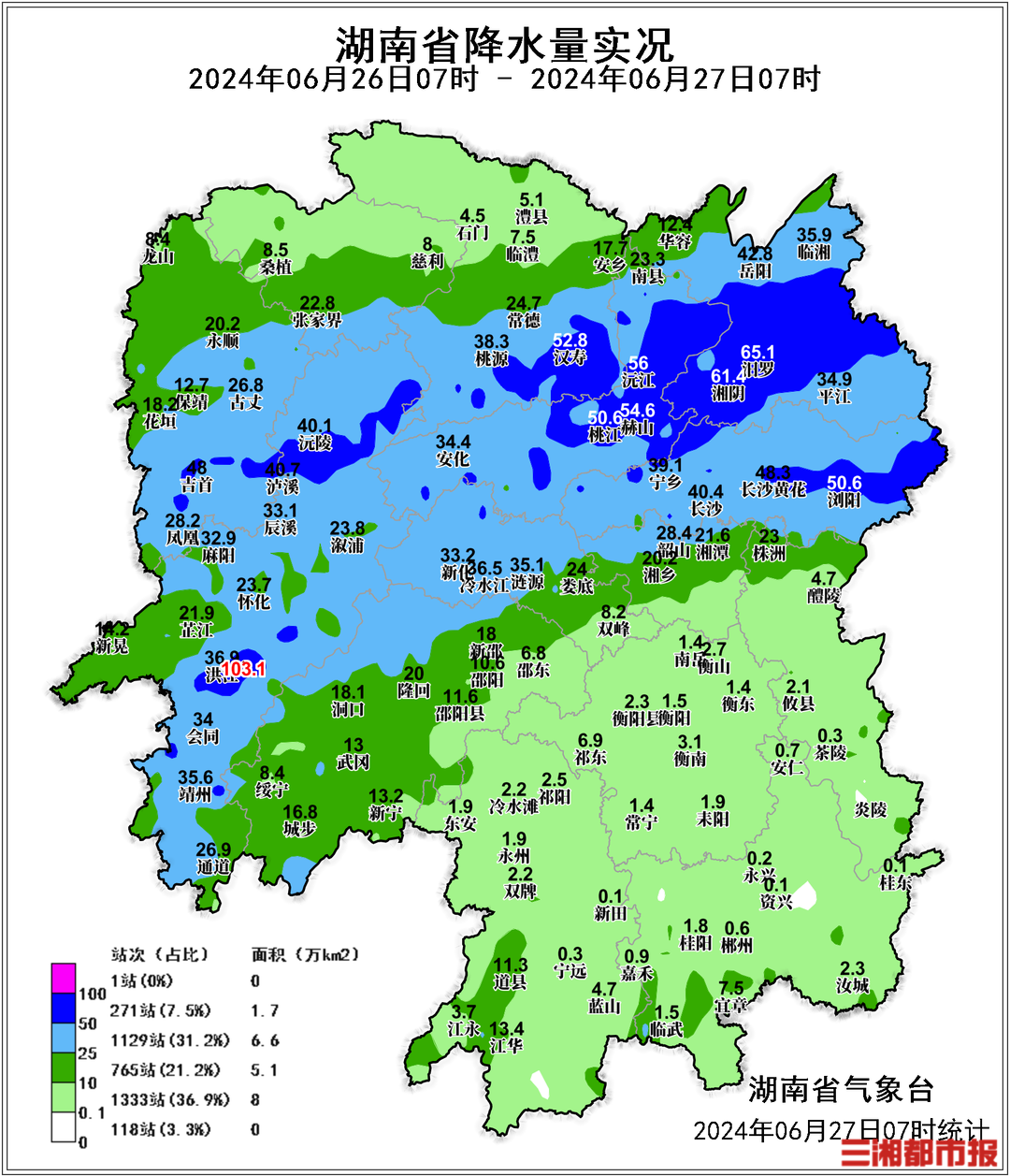 华声在线6月27日讯(全媒体见习记者 李致远)记者今日从湖南省气象台获悉,6月26日7时至27日7时,洪江黔城镇出现大暴雨(103.1毫米)。该镇小时雨强为最大(30.3毫米,26日22时至23时)。此外,怀化、湘西州、长沙、岳阳、益阳、常德、娄底7市(州)30县(市、区)177乡(镇)出现暴雨。