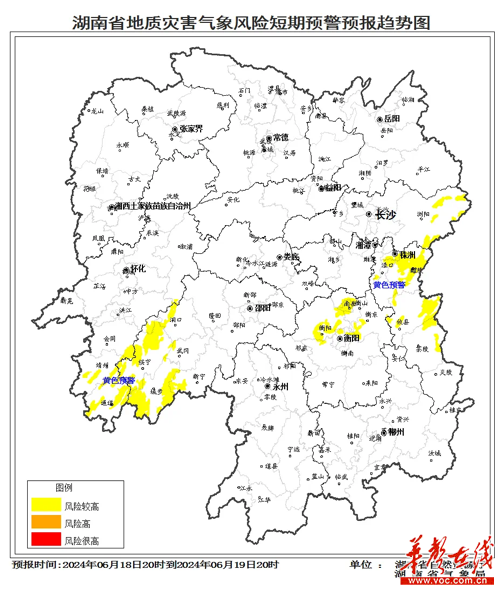 华声在线6月18日讯(记者 赵瞳铱)根据地质灾害成灾规律和孕灾条件,结合6月18日短期气象预报情况,省自然资源厅与省气象局联合会商得出如下结论:自6月18日20:00至19日20:00,受降雨影响,湘东、湘西南大部分区域发生突发性地质灾害风险较高(黄色预警)。
