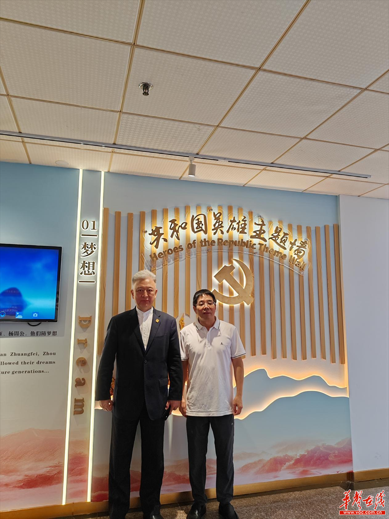 顾伯平(左)与聂茂(右)在共和国英雄主题墙前合影