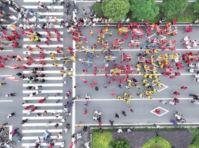 5月31日上午,“走!去永州,追理学文化之光”道县2024年周敦颐理学文化推介活动启动暨国家非遗道州龙船“百龙出征”仪式举行。分会场上,12艘道州龙船、88个龙船头排满街道,正待“出征”。百余支本土龙船队或抬龙船、或抬龙头,在激昂的锣鼓声中,从道县公安局出发,经过湘源中路、潇水北路、西关桥头与老文昌阁码头才下水。一名不到6岁的小孩跟着家人站在船头,用稚嫩的嗓音喊着口号,带动全船壮员呼应,一度成为全场人气热点。途经一家幼儿园时,有老师组织小朋友在园门前排了三排,边挥舞手臂边喊口号,给街道上行走的船队加油。