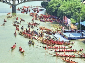 潇湘晨报永州讯 从5月31日上午浩浩荡荡的“百龙出征”仪式开始,一年一度的湖南道县本土龙船赛拉开帷幕。潇水河畔从早到晚挤满了观众,看200多支龙船队伍、6000多名本土队员每天在河面奋力竞拼。此外还有来自广东、广西等地龙舟队参加中国龙舟公开赛(永州道县站)。热闹紧张的三天赛事中,既有本土龙船的传统韵味,又有竞技龙舟的迅疾风采。