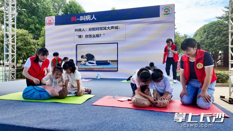 中南大学湘雅医院急诊科副主任护师曹晓霞率志愿者团队结合溺水和紧急救援案例,讲授心肺复苏术、海姆立克急救法等理论知识,并邀请亲子家庭轮流上台实操练习。“我带着孩子一起学习并实操了这些急救技能,这对我们很有用,掌握了一项救人的本领。”刚刚学完急救知识的家长刘女士兴奋地说道。