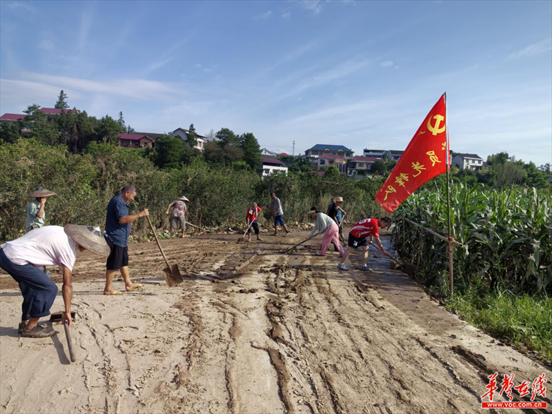 洪水退后,工作队第一时间深入田间地头、农户家里等受灾现场核实情况,并组织党员干部20余人积极开展复工复产,补种农作物,清理倒塌树木和机耕道淤泥。面对被冲毁的灌溉水渠,驻村工作队与村干部、村民现场商讨解决方案,在最短时间内恢复水渠的正常功能。