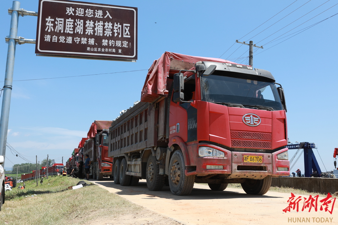 华声在线7月6日讯(全媒体记者 奉永成 王亮 郭立亮 见习记者 童臻熙)7月6上午,记者在团洲垸洞庭湖一线大堤上看到,各种装载块石料等堵口物料的大型运输车辆来往穿梭,将物料紧急运输到决口附近,一旦开始堵口,可就近使用。据专家测算,堵口所需物料巨大,包括钢丝网石笼、块石料、砂卵石等。