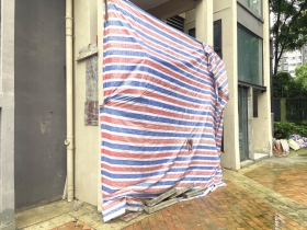 左图:汇金城小区业主告诉记者,4栋101的业主加装夹层,对墙面进行了破坏,他们担心承重墙受损。图为被砸开的墙面。图/受访者提供 右图:7月1日,记者发现101室外已经用木板、篷布遮挡了起来。图/记者满延坤
