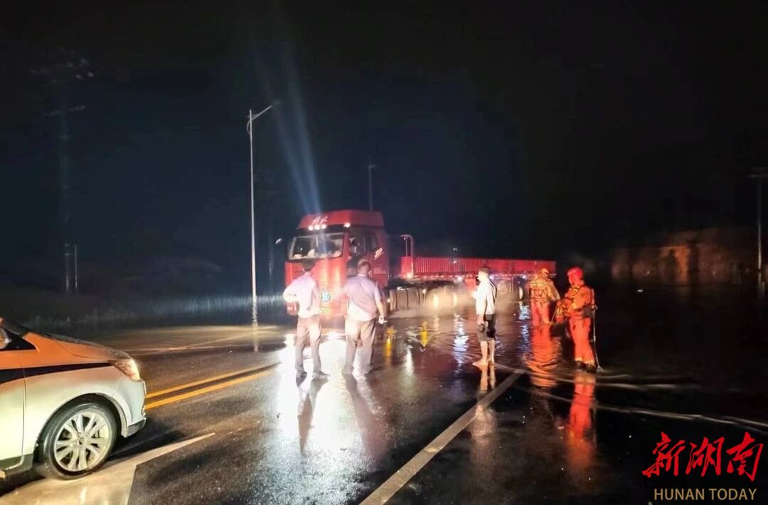 “指挥部,金龙村左公大道发现被困车辆和人员,请求支援!”6月30日凌晨1点左右,湘阴县金龙镇防汛抗旱指挥分部接到求援电话,两名值班人员在前往辖区梅花塘水库巡查汛情时,发现一低洼处积水严重,一辆红色大货车和一名司机被困水中。