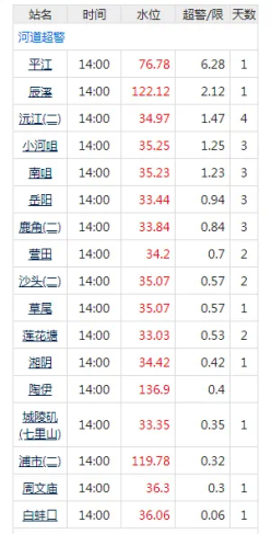 截至7月1日14时,我省仍有17站超警,主要在洞庭湖区、沅水中上游。
