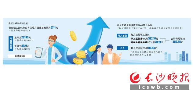 长沙晚报8月28日讯(全媒体记者 徐媛 通讯员 欧阳振华)28日,记者从湖南省医疗保障局获悉,该局近日联合国家税务总局湖南省税务局、湖南省财政厅出台了《关于确定2024年度全省职工基本医疗保险和生育保险月缴费基准值的通知》。自2024年9月1日起,全省职工医保和生育保险月缴费基准值为6711元(较上年增加427元),月缴费基数的上限为20133元(基准值的300%),下限为4027元(基准值的60%),有效期1年。医保部门提醒,用人单位和职工私下“约定”不缴医保,是违法行为,同时等于放弃了医保待遇。