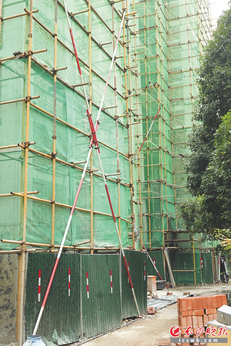 记者在现场看到,一楼电梯口堆积着不少建筑材料,周边搭建着脚手架和绿色围挡,未见到有工人施工。 长沙晚报全媒体记者 罗悦 摄