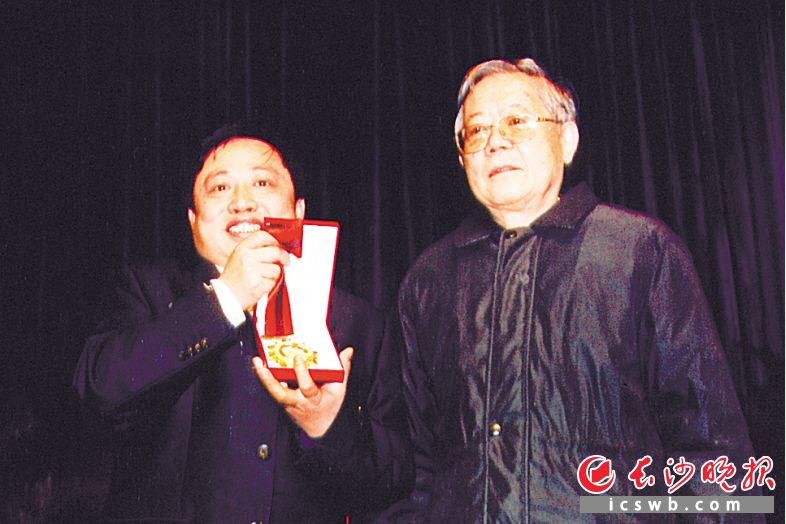 2003年12月7日,周光召院士(右)将“两弹一星功勋奖章”赠予宁乡一中。 宁乡一中供图