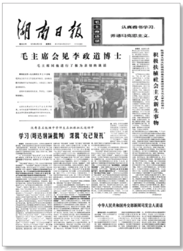 1974年5月31日的《湖南日报》头版,转载了新华社的一条电稿并配发图片——1974年5月30日,毛泽东会见了来华探亲、访问的美籍中国物理学家李政道博士,同他进行了极为亲切的谈话。