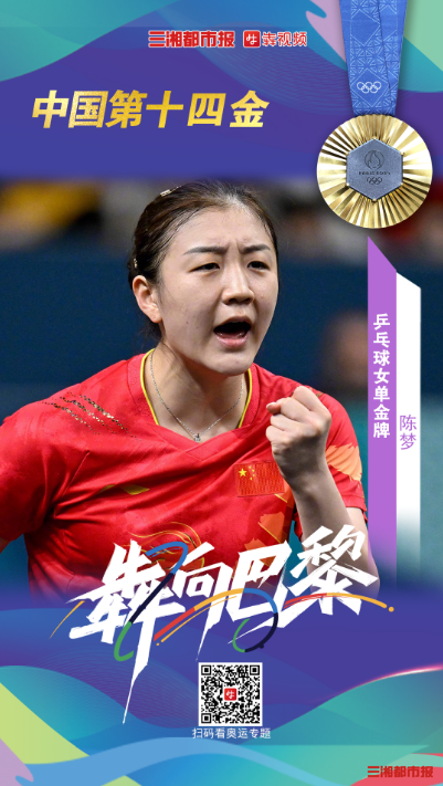 北京时间8月3日晚,在巴黎奥运会乒乓球女子单打比赛中,陈梦成功卫冕,夺得金牌。这也是中国代表团在本届奥运会上获得的第14枚金牌。