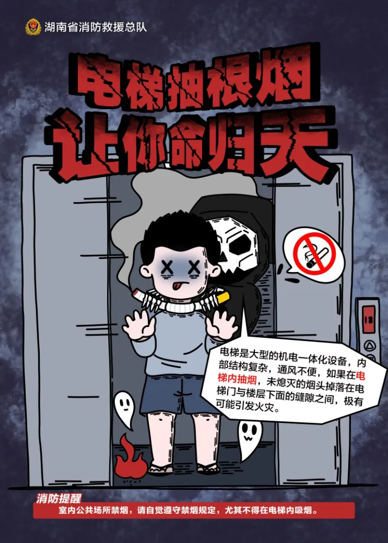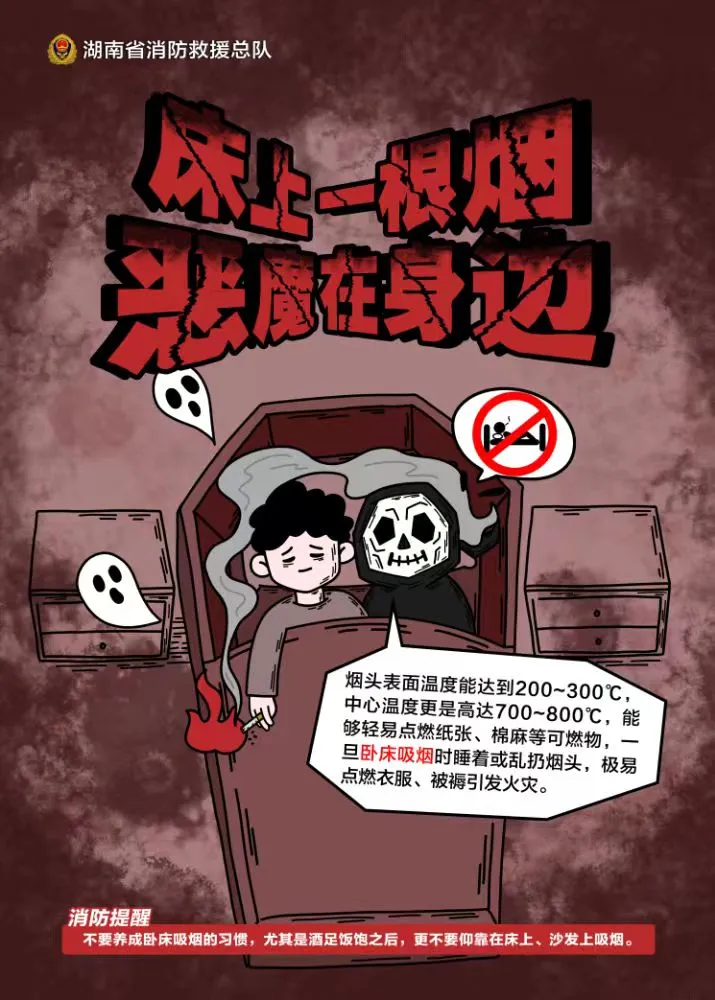 众所周知,吸烟有害健康,就连香烟包装外壳都在无声地“提醒”着我们。然而,尽管这一事实广为人知,我们周围依然“烟雾缭绕”。在这看似平常的背后隐藏着怎样的危机?为了深刻揭示吸烟不良行为与火灾之间的紧密联系,提高公众对吸烟引发火灾危害的认识,湖南消防联合湖南日报精心策划并推出“死神来了”消防主题海报。