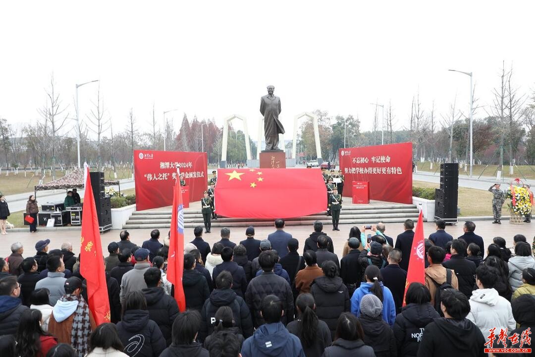 华声在线12月26日讯(通讯员 李雯雯 向润源) 12月26日上午,湘潭大学师生满怀崇敬之情,齐聚该校南校门毛主席铜像广场,举行2024年“伟人之托”奖助学金颁发仪式,纪念毛泽东同志诞辰131周年。仪式上,湘潭大学获赠的天安门广场国旗首次公开展示,这面国旗曾于2024年9月10日该校校庆日时,在天安门广场升起。