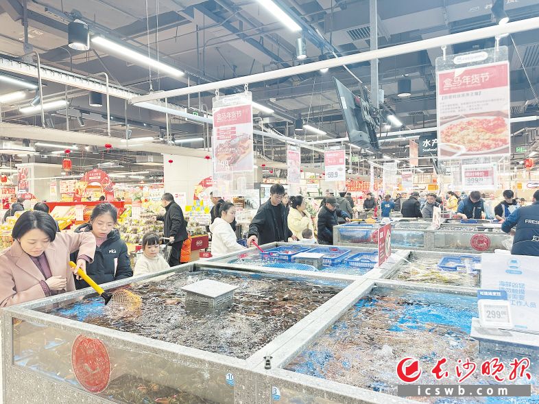 在盒马超市里,市民正在挑选水产品。 长沙晚报实习生 钟知方 摄