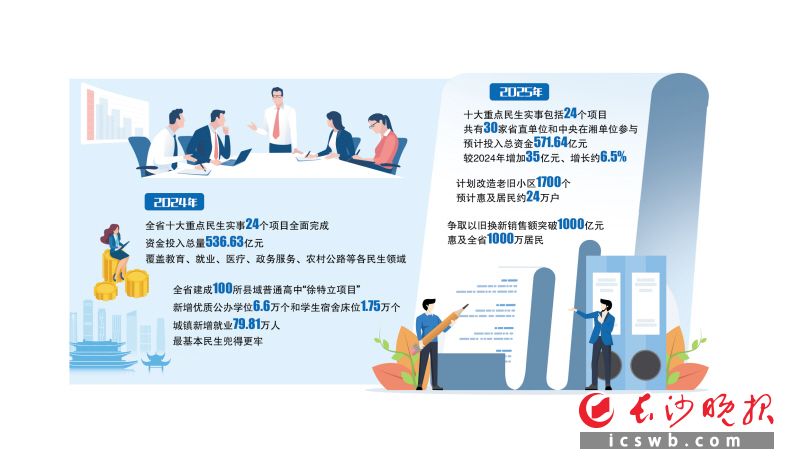 省两会上,省政府将“扎实办好十大重点民生实事”写入2025年政府工作报告,实施民生补短提质攻坚。据悉,今年十大重点民生实事包括24个项目,共有30家省直单位和中央在湘单位参与,预计投入总资金571.64亿元,较2024年增加35亿元、增长约6.5%。