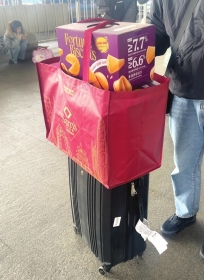 来自湘西凤凰的王先生今年26岁,自2021年离家入伍后,还未曾回过家。这次回家,他带的东西全是零食,有蛋糕、饼干等,行李箱塞得满满当当,还额外装了两个大袋子。