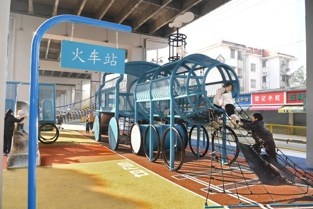 东风路立交桥运动公园,“火车站”蓝色站牌高悬桥底,儿童滑梯游乐设施被设计成蒸汽机车车头造型,远看犹如老长沙火车北站在桥下通车,再次唤起老街坊们的共鸣。