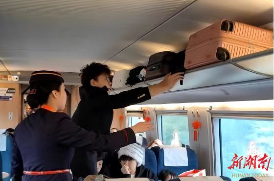 1月23日,正值南方小年,长沙至张家界西的C7786次列车在晨光中缓缓驶出长沙火车站。车厢内,湖南铁路科技职业技术学院大一学生文承玺身着笔挺的铁路制服,与列车长游敏前后而行,他们细致地巡视着每一寸空间,确保过道畅通无阻,为旅客营造安全舒适的乘车环境。