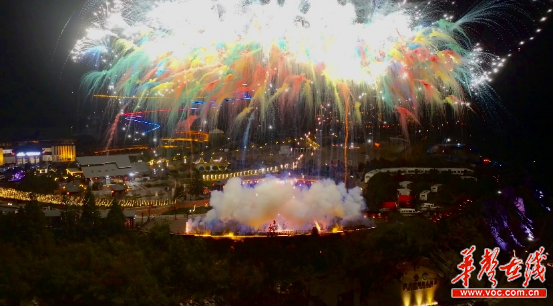 28日下午,沿着老司城旅游度假区蜿蜒的小径漫步,特色小吃琳琅满目,道路两旁特制的福字装饰引得游客们拍照打卡。傍晚时分,无人机载着“财神爷”模型缓缓升空,抛下象征幸福财运的红包雨。摆手堂舞台上演音浪派对,绚烂的灯光随着音乐节奏跳动。