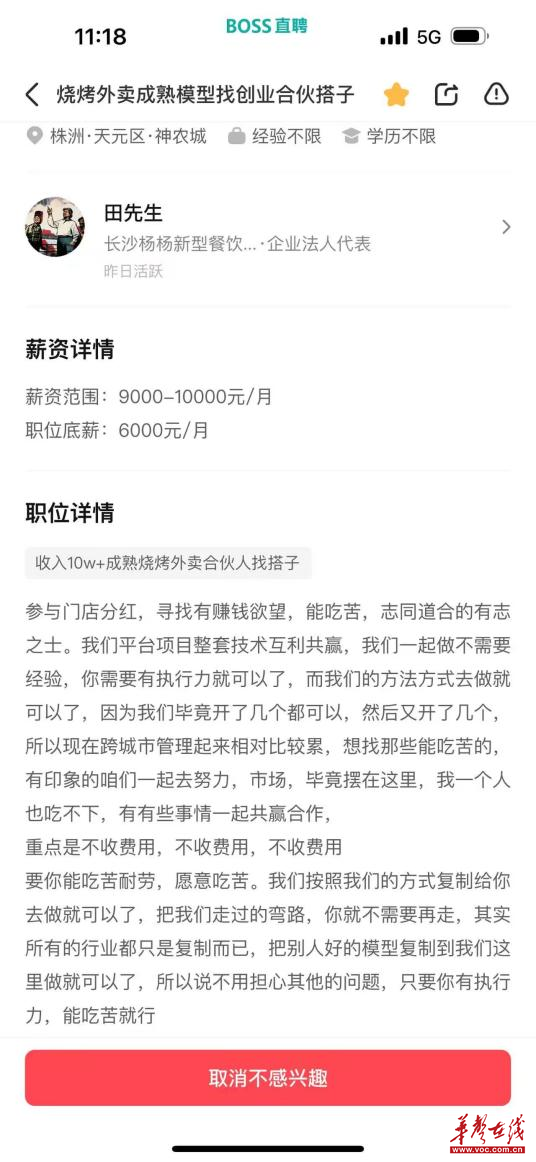 小陶告诉记者,2024年12月11日,他在BOSS直聘平台上看到一条“烧烤外卖成熟模型找创业合伙搭子”的招聘信息。他联系信息发布方,作了一番了解后,颇为心动,认为可以赚快钱。