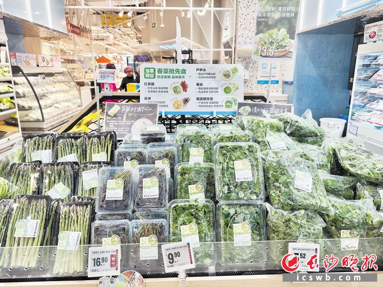 而在佳兆业广场的盒马门店,只见一排排蔬菜分门别类摆放得井井有条,香椿、桑叶、春韭、茼蒿等各类春菜占据了显眼位置,市民们在摊位间穿梭,挑选喜爱的春菜。其中,红香椿14.9元/100g、雷笋14.9元/550g、芦蒿9.9元/200g,价格比普通蔬菜略贵。“春菜有独特的香气,其他季节都吃不到,我们全家都喜欢吃芦蒿炒腊肉。”市民陈女士精心挑选了一份芦蒿,准备与家人共同分享这口来自春天的美味。