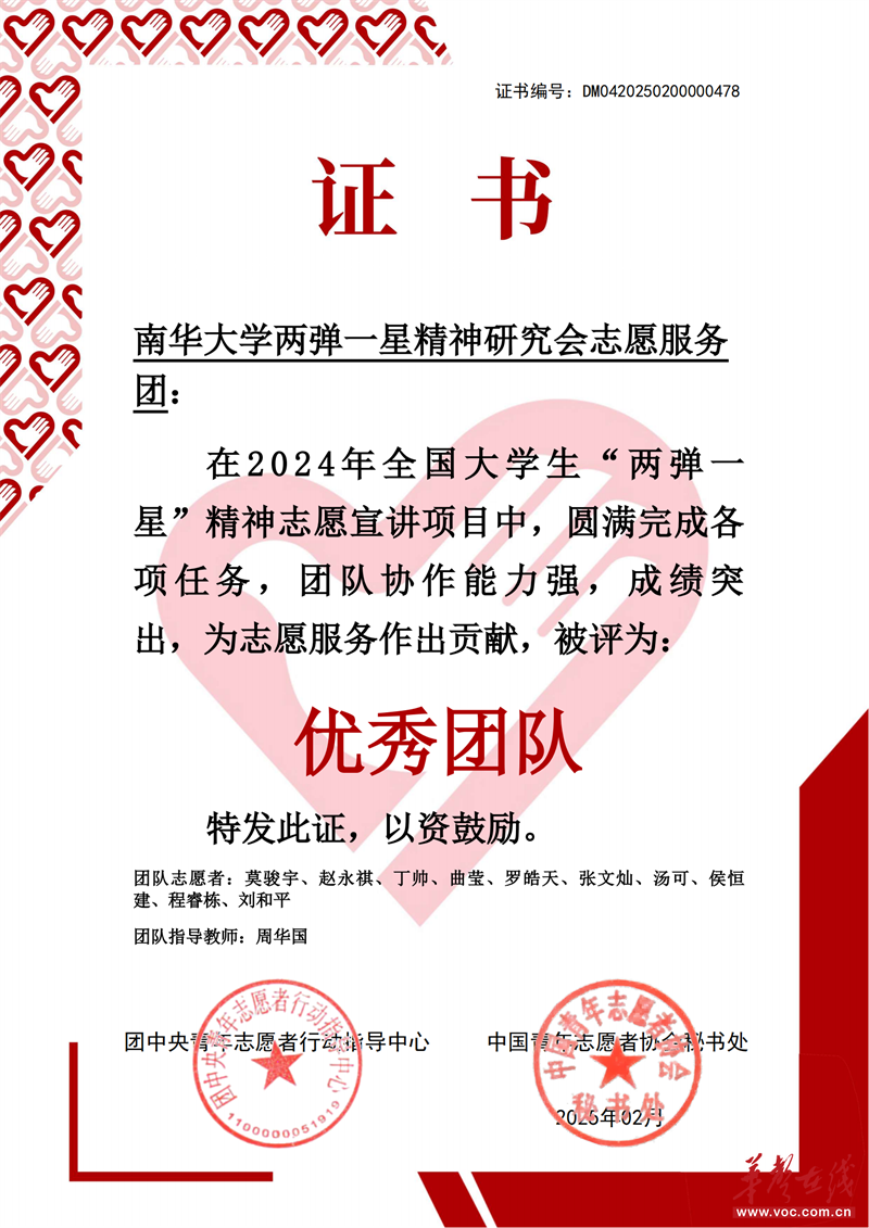 华声在线2月21日讯(通讯员 周华国 莫骏宇 张渝晗)近日,团中央青年志愿者行动指导中心、中国青年志愿者协会秘书处公布了2024年全国大学生“两弹一星”精神志愿宣讲活动优秀团队名单。南华大学“两弹一星”精神研究会志愿服务团于全国1000余支志愿宣讲团中脱颖而出,获评“优秀团队”。