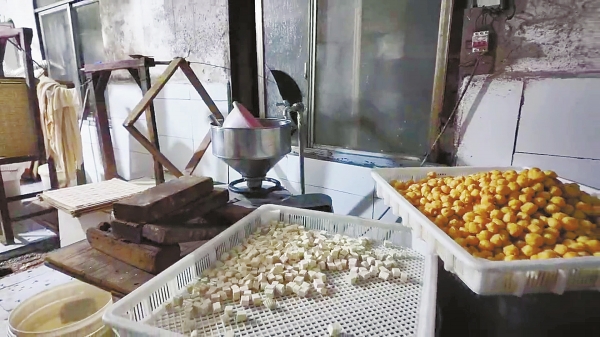 在另一家作坊,记者看到,已压制成型的三筐豆腐随意地叠放在一把破旧椅子上。椅子周围杂乱地堆放着废弃纸箱、包装材料和胶鞋等杂物,一只黑色的猫正蜷缩在纸箱上打盹。旁边锈迹斑斑的铁质货架上,随意摆放着各种盛装豆制品的托盘、容器及其他与生产无关的杂物,生产环境堪忧。