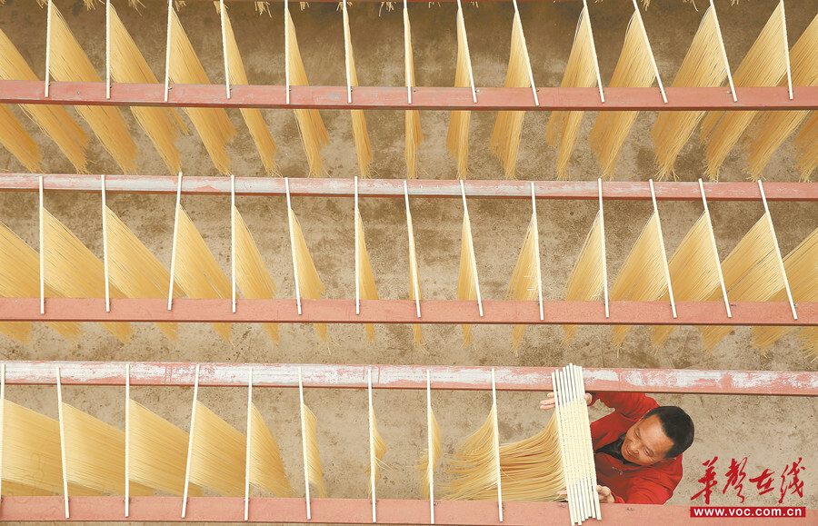 4月1日,龙山县召市镇双进社区,村民在忙着晾晒面条,供应市场。近年来,该县积极引导乡村能人创办面条、粉条等作坊,拓宽当地群众增收渠道。