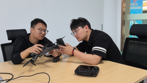 “00后”小伙宋晨强将公司落户望城经开区大学生创新创业基地,开启低空经济赛道逐梦之旅,目标是三年内年产值超800万元。图为宋晨强(右)和团队伙伴正在公司讨论研发的新产品。(望城经开区供图)