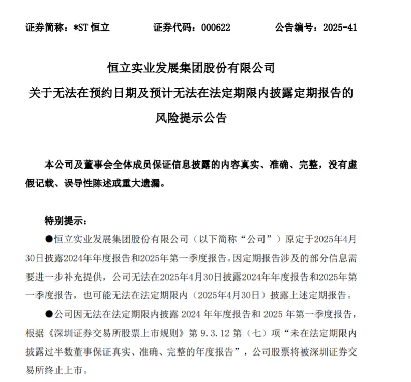 *ST恒立为湖南上市公司,早在4月30日,其发布公告称,无法在2025年4月30日披露2024年年度报告和2025年第一季度报告,也可能无法在法定期限内(2025年4月30日)披露上述定期报告。目前,*ST恒立濒临退市。