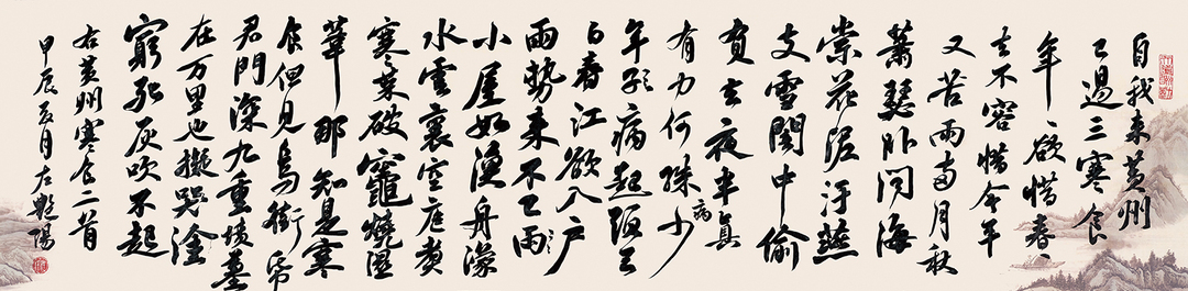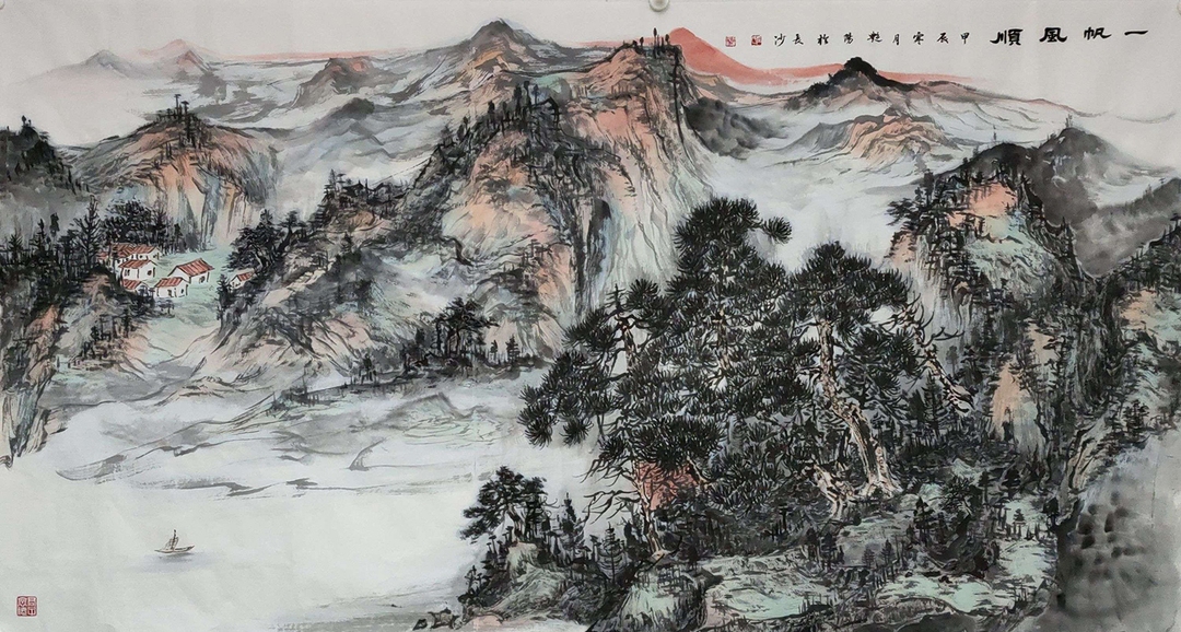 在山水画创作上,左艳阳追求“外师造化,中得心源”的境界。她遍访名山大川,将自然之美与心中之情融为一体创作出意境深远、气韵生动的山水佳作。其笔墨苍润相济,构图疏密有致,画面虚实相生,营造出空灵幽远、气象万千的艺术境界。