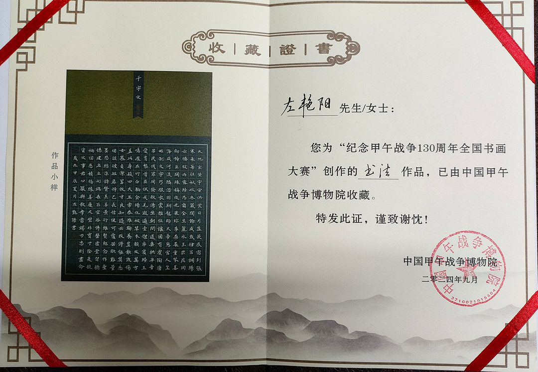 书法方面,左艳阳诸体兼擅,尤以隶楷行见长。其书法作品笔力遒劲、结体严谨、章法自然,流露出深厚的传统功力和独特的个人风格。
