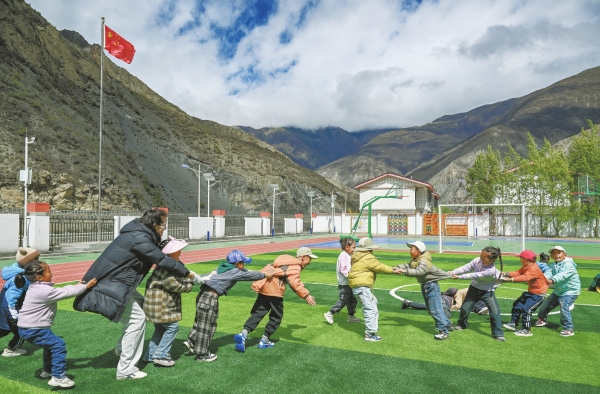 课堂之外,孩子们跳锅庄、踢足球,欢声笑语不断。次仁索朗告诉记者:“现在条件好了,孩子们个个都愿意待在学校里。”