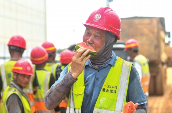 6月30日,永州市道县蚣坝镇湖南紫金锂多金属新材料有限公司项目建设现场。连日来,当地气温持续偏高,建设单位采取"错峰施工"模式,同时为一线工人发放包含防暑药品、清凉饮料等物资的“清凉礼包”。图/通讯员蒋克青