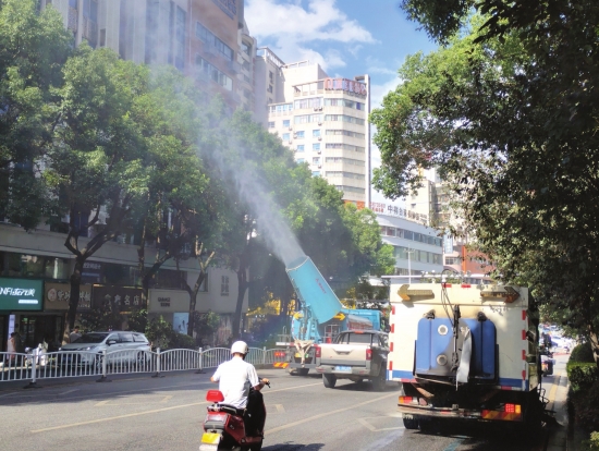 7月1日,郴州市北湖区街头,环卫车辆开启水雾喷洒作业。炎炎夏日,通过喷水雾的方式为城市道路“降温”。图/通讯员贺茂峰