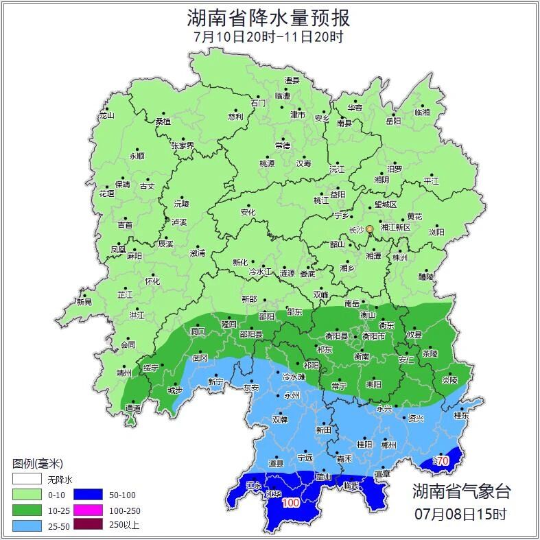7月10日晚上至11日白天,湘南阴天有中到大雨,其中郴州(汝城、宜章、临武)、永州(江华、江永、道县、蓝山、宁远)有暴雨,其他地区阴天有阵雨或雷阵雨;北风4~5级减小到2~3级,阵风8~10级;最高气温29~34℃,最低气温24~27℃。