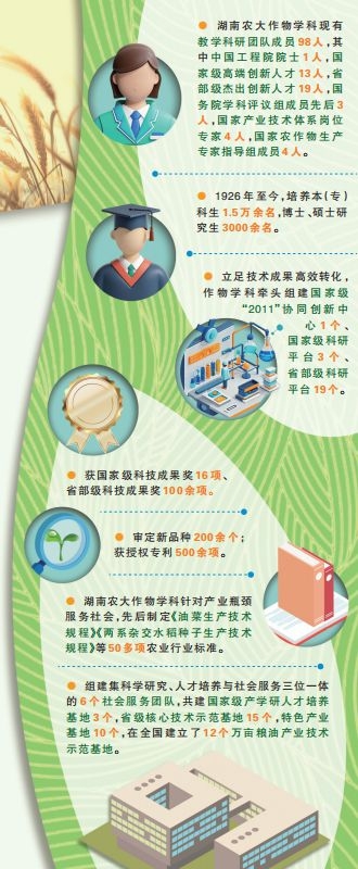 湖南农业大学作物学科创建于1926年,跨越两个世纪,一代又一代“作物”人,讲台授业,田野扎根,育苗、护苗、送苗,扛牢国家粮食安全重任,铸就了“扎根大地、求实创新”的湖南农业大学作物学科精神。