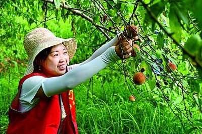 志愿者在油溪桥村采摘水果。刘新山摄/光明图片