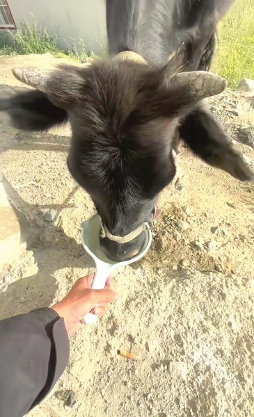 “正好去倒水,它(牛)跑到这边舔草,我想它应该渴了,就拿瓢喂它,发现它一口喝完了,再换一瓢又喝完了,索性换桶喂,网友们觉得很有趣。”