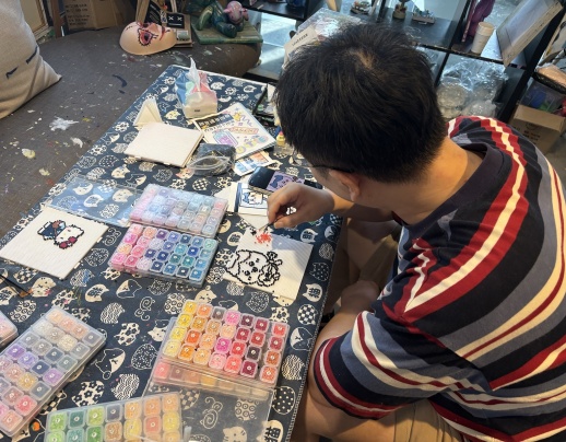 9月9日傍晚,记者来到位于长沙泊富I CITY的“艺术实验室”,有两名顾客自行在网络上搜索喜欢图案的图纸,并在店员的指导下,小心翼翼地将五颜六色的豆子整齐码放在底板上。不到一个小时,两人将拼好的豆子用熨斗轻轻一熨,原本零散的豆子便紧紧粘合成型,一个hello Kitty和chikawa卡通样式的钥匙扣和冰箱贴便完成。“熨完还是热乎的,透着手工的温度。”一名顾客边说边拿起成品拍照记录。