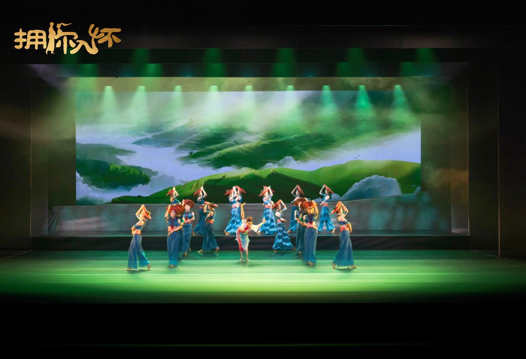 除了剧情,《拥你入怀》的舞台设计成为关注亮点。全剧以多媒体投影结合实景布景,将怀化的梯田、沅水、荷塘、雪峰山、山背村落与田野农耕场景立体呈现。晨雾缭绕、稻谷翻金、月光洒落荷塘、火塘映红冬夜,光影与自然景观交织成流动画卷。舞美的细腻与层次感让观众仿佛置身田园,与人物同步呼吸。