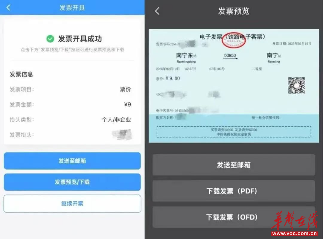 电子发票开具后,旅客可通过“12306”App、“个人所得税”App查询下载,或通过邮件接收;若信息填写错误、企业信息变更,在原开具时限内可申请换开3次。