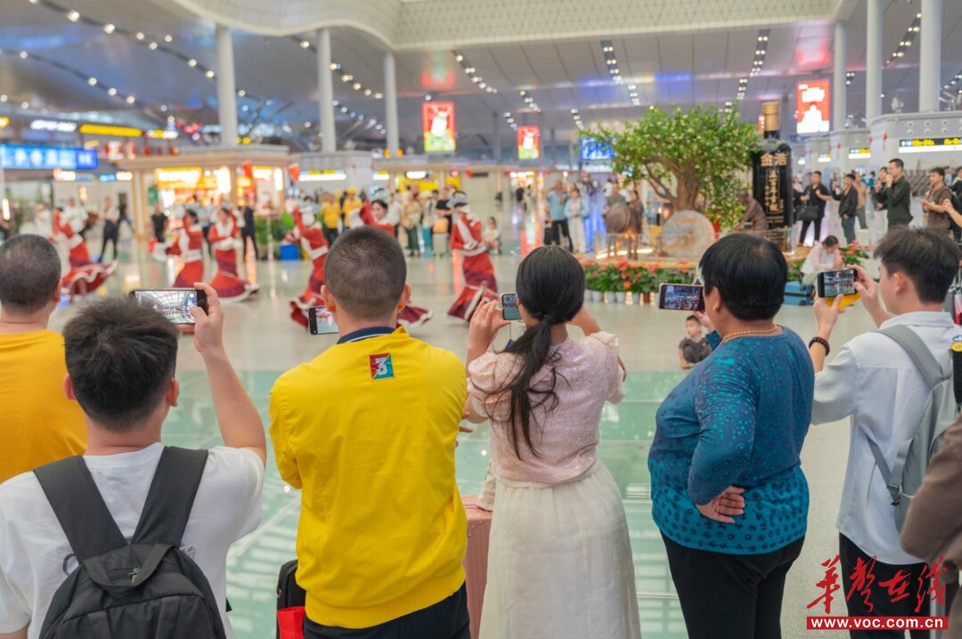 (铜官窑国风乐园表演人员在长沙南站进行快闪表演,游客驻足观看。长沙南站供图)