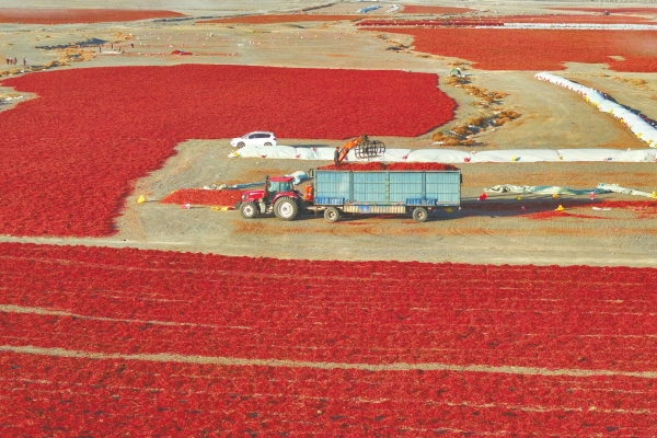 秋天的新疆,粗犷而浪漫,凉风从亚欧大陆腹地徐徐而来,大地被涂上明丽的色彩,天山脚下被满地辣椒染得通红。