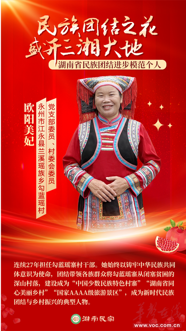 欧阳美妃,连续27年担任江永县勾蓝瑶寨村干部。她与村“两委”干部团结各族群众,将深山村落勾蓝瑶寨建成“中国少数民族特色村寨”“湖南省同心美丽乡村”“国家AAAA级旅游景区”,成为新时代民族团结与乡村振兴典型人物。2025年9月,湖南省委、省政府授予欧阳美妃“湖南省民族团结进步模范个人”称号。