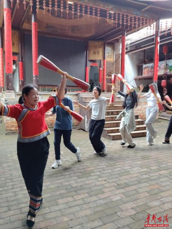 欧阳美妃(左一)带着游客参与瑶族民俗表演。受访者供图