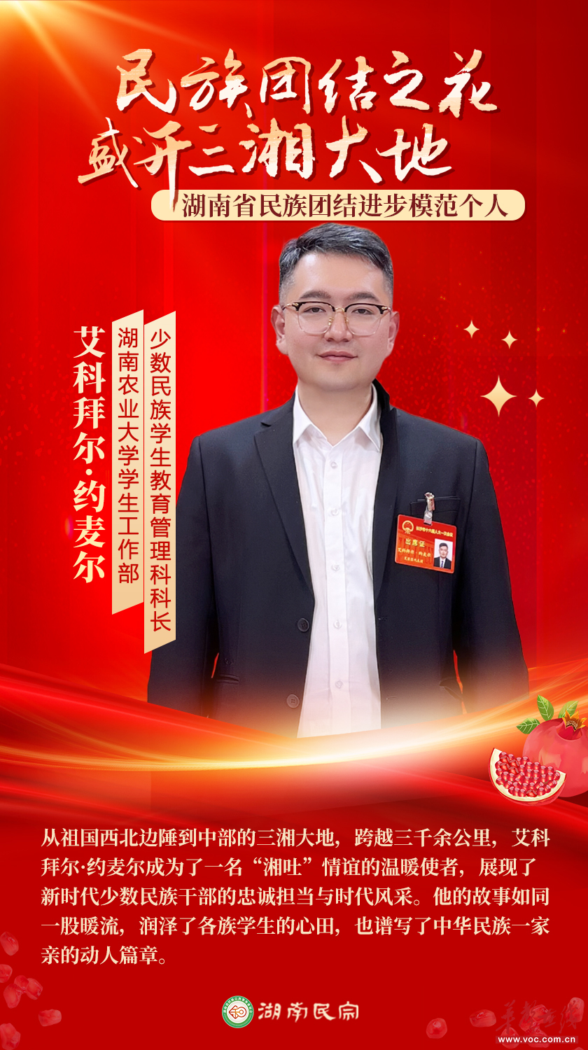 艾科拜尔·约麦尔,维吾尔族,新疆吐鲁番人。现任长沙市第十六届人大代表、市人大民族华侨外事委员会委员、湖南农业大学学生工作部少数民族学生教育管理科科长。从新疆到湖南,跨越三千余公里,他成为一名“湘吐”情谊的使者,展现了新时代少数民族干部的忠诚担当与时代风采。2025年9月,中共湖南省委、湖南省人民政府授予艾科拜尔·约麦尔“湖南省民族团结进步模范个人”称号。
